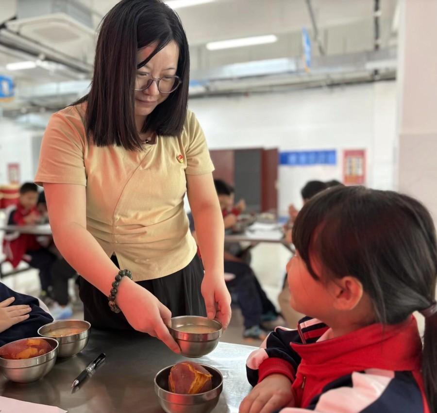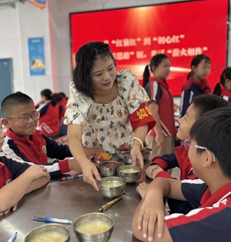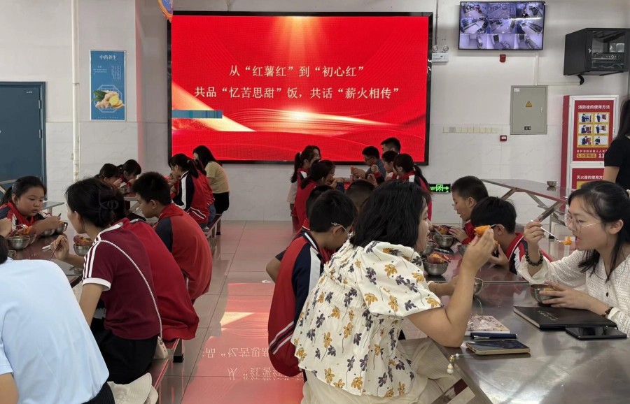 接著,在香氣氤氳的食堂里,黨員教師們與此前參與“挖芋隴、種紅薯”勞動課程的學生代表,一同品嘗“憶苦思甜飯”。孩子們邊吃邊分享勞動的感受,黨員教師們也借此契機與他們共話“薪火相傳”,回憶曾經的崢嶸歲月,在一勺一口中體會“幸福生活來之不易”的深意。