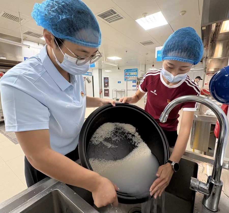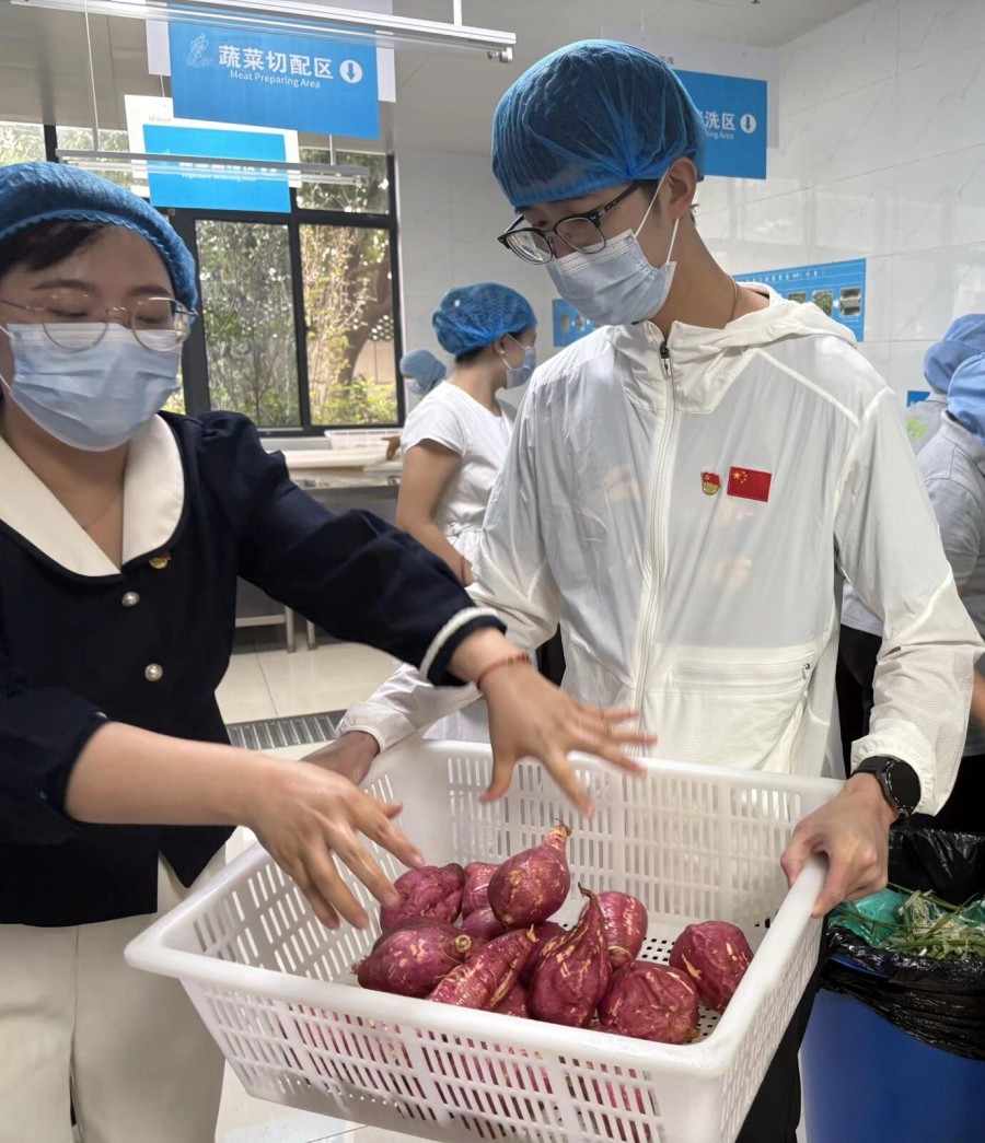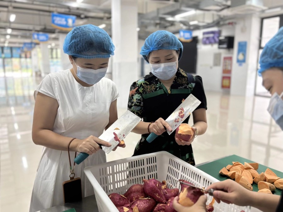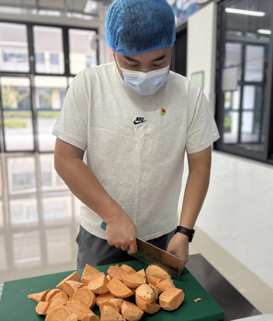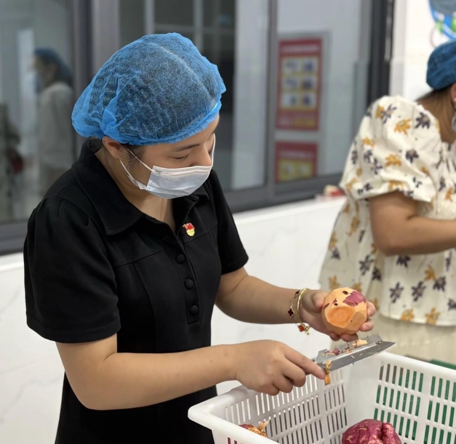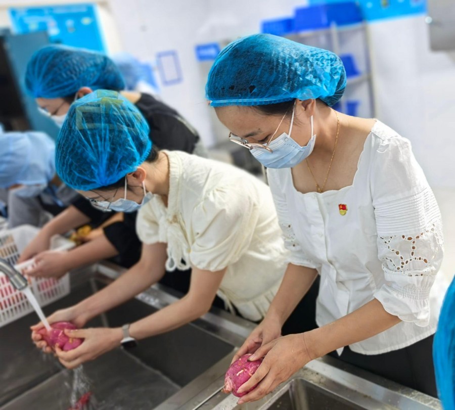 活動開始,全體黨員來到學校食堂,分工協作,有序忙碌起來——洗凈紅薯、削皮切塊、淘米煮粥、蒸制紅薯。陣陣熱氣中,飄出的不僅是香甜的味道,更是黨員教師親手勞動的喜悅與熱情。