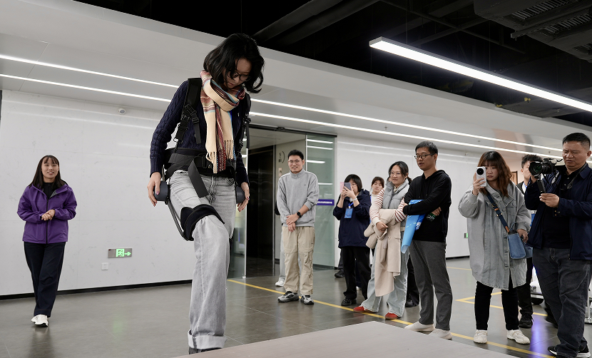 在康養(yǎng)機(jī)器人展區(qū),“科技賦能生活”的溫度觸手可及。一位采訪(fǎng)團(tuán)成員現(xiàn)場(chǎng)穿戴上一款無(wú)源雙髖助力機(jī)器人后,驚喜地表示:“上樓梯都不用我自己用力抬腿,真的很給力!”