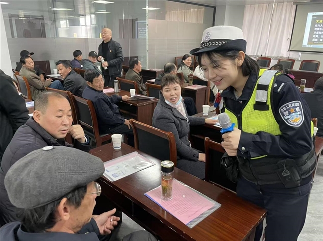 活動中,老峰鎮派出所許所長首先借助發生在轄區的真實案例,通過邀請群眾估猜案件中受騙居民受騙金額以及老峰鎮轄區平均受理相關案件數量等互動方式,不僅聚焦了群眾的注意力,還通過龐大的涉案金額加深了宣傳印象,極大地提升了參會群眾的反詐意識。緊接著,來自市交警五大隊的儲警官則結合轄區道路交通處罰的實際情況,通過詢問參會人員日常是否因違反交通規則而受到過交通處罰拉近與大家的心理距離,再進一步強調解釋道:處罰的目的只有一個,促使大家騎行正確佩戴頭盔,做自己生命安全的第一責任人。除此之外,儲警官還結合兩條道路交通安全警示片向參會群眾講解了右轉危險區等交通盲區的危害性以及“一盔一戴”的重要性,提醒轄區群眾切勿心存僥幸、疏忽大意,在日常出行中要嚴格遵守交通法規,自覺抵制各種不文明交通行為,養成良好的交通習慣。